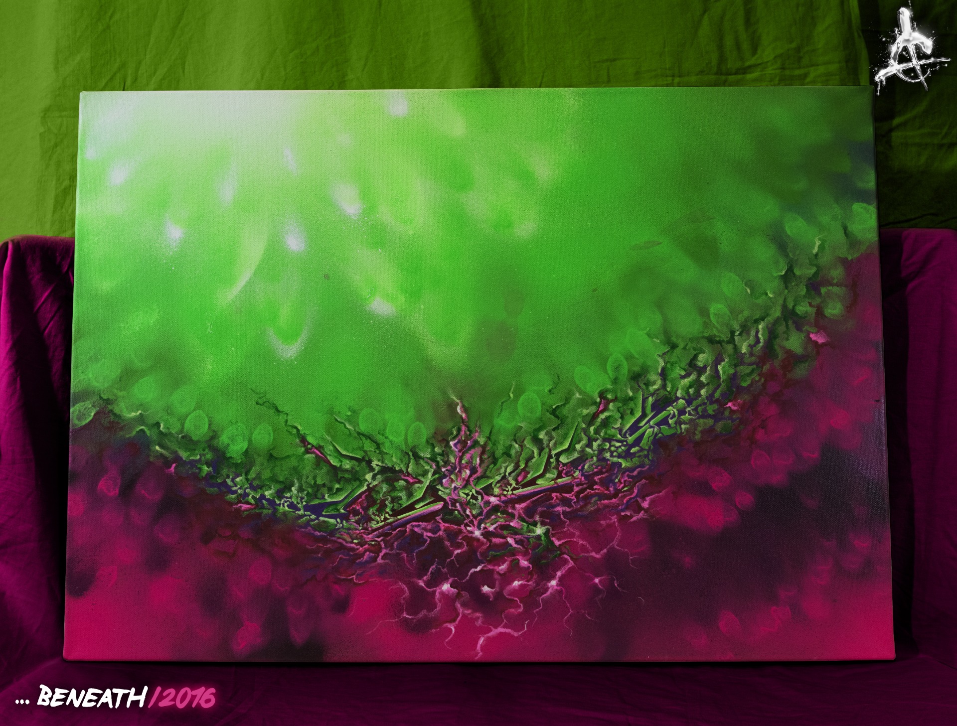 Pohľad spod hladiny? Alebo korene hlboko v zemi? A čo tie bodky dole čo vyzerajú ako hlavy? Viackrát sme sa s kamarátmi zamýšľali nad týmto obrazom. Väčšinou ocenili farebnosť a to zvláštne zvraštenie môjho graffiti piecu. No aj tak som stále počúval nové a nové pohľady naňho. Názov diela je "BENEATH" - pod povrchom, pretože to nápadito pripomína pohľad z hĺbky, či už jazera alebo duše. Preto jeho opis radšej nechám na nového majiteľa, pretože pri týchto kúskoch tam naozaj každý vidí niečo iné, čo je v konečnom dôsledku výborné a som za to vďačný.