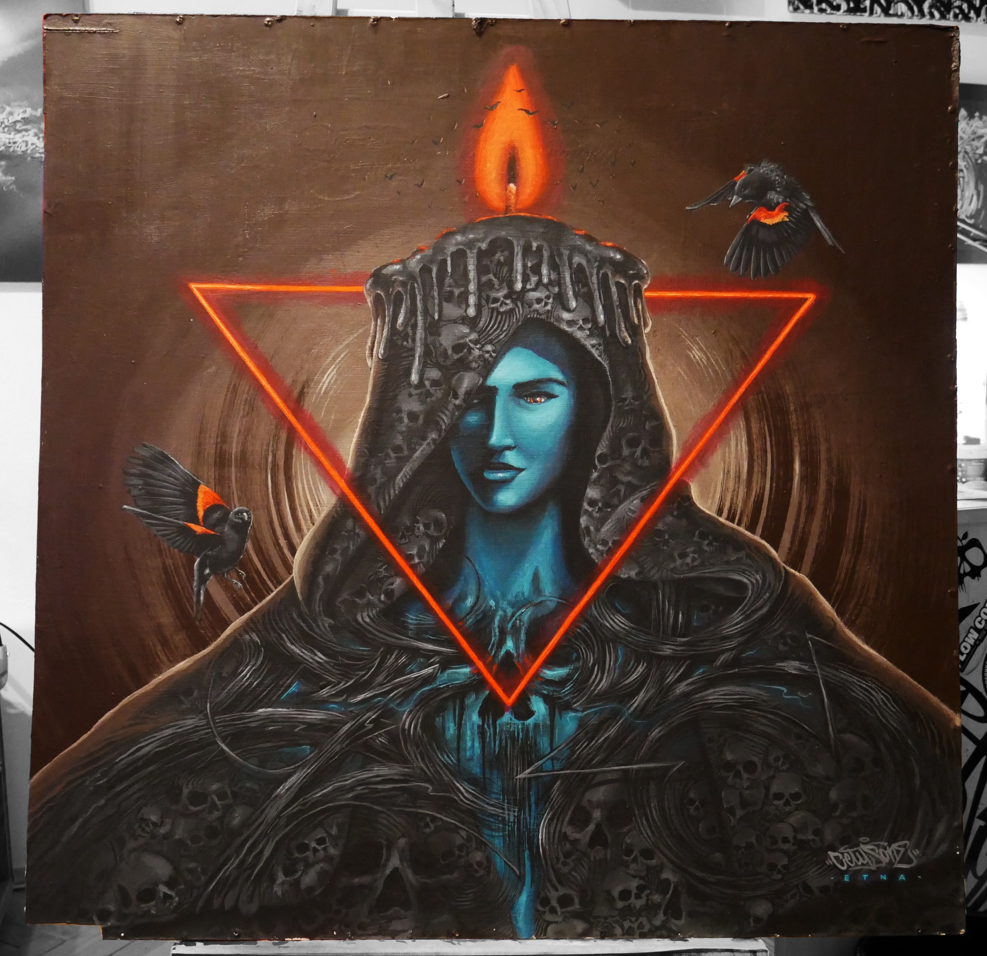 Mnohým sa pri názve svetoznámej sopky "ETNA" okamžite naskytne pocit úcty a rešpektu k tomuto neuveriteľnému prírodnému úkazu. V tomto prípade si podobu tejto sopky prevzala mýtická ženská bytosť s dominantným zapáleným knôtom na hlave ako reprezentácia uplynutého a zostávajúceho času, pokým znova príde čas na erupciu. Neónový oranžový rám v tvare trojuholníka iba pozdvihuje celkovú symboliku a dôležitosť tohto javu. Ako sa hovorí každý pohár raz pretečie, každý knôt raz vyhorí. Tak isto sa to deje aj s ľudskou trpezlivosťou. V tomto prípade sú ľudia zobrazení ako zvedavé čierne vtáctvo zoskupujúce sa okolo masívneho ohňa s očakávaním čo nastane po vyhoretí. Celý overal tejto ženy je pokrytý lebkami a drôtmi ktoré popisujú memento obetí a ničivosti tohto nespútaného živlu.