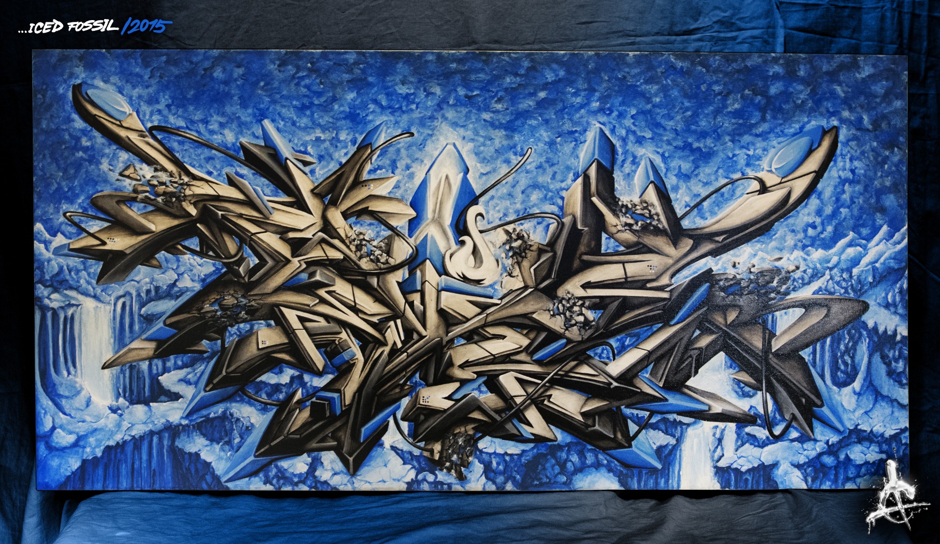 Môj prvý pokus o 3D graffiti na plátne nesúci názov "ICED FOSSIL" - zamrznutá fosília. Tu je vidieť akú podstatnú úlohu zohrávali graffiti v mojej vtedajšej ortodoxnej tvorbe. Prepracovaný 3D piece zarovnaný na stred ťahajúci sa celou dĺžkou plátna tvorí dominantu celého diela. Preplnené pozadie nenecháva ani kúsok bez efektu, a nenájdeme momentum, kde by sa niečo nedialo. Mne osobne prináša toto dielo príjemnú nostalgiu časov, kedy sme pilovali štýl a čím viac vrstiev písmená obsahovali, tým boli viac dope (v zmysle dobré). Táto informácia ostala zamrazená v čase a jestvuje ako dôkaz tvrdej práce za každým jedným dielom.