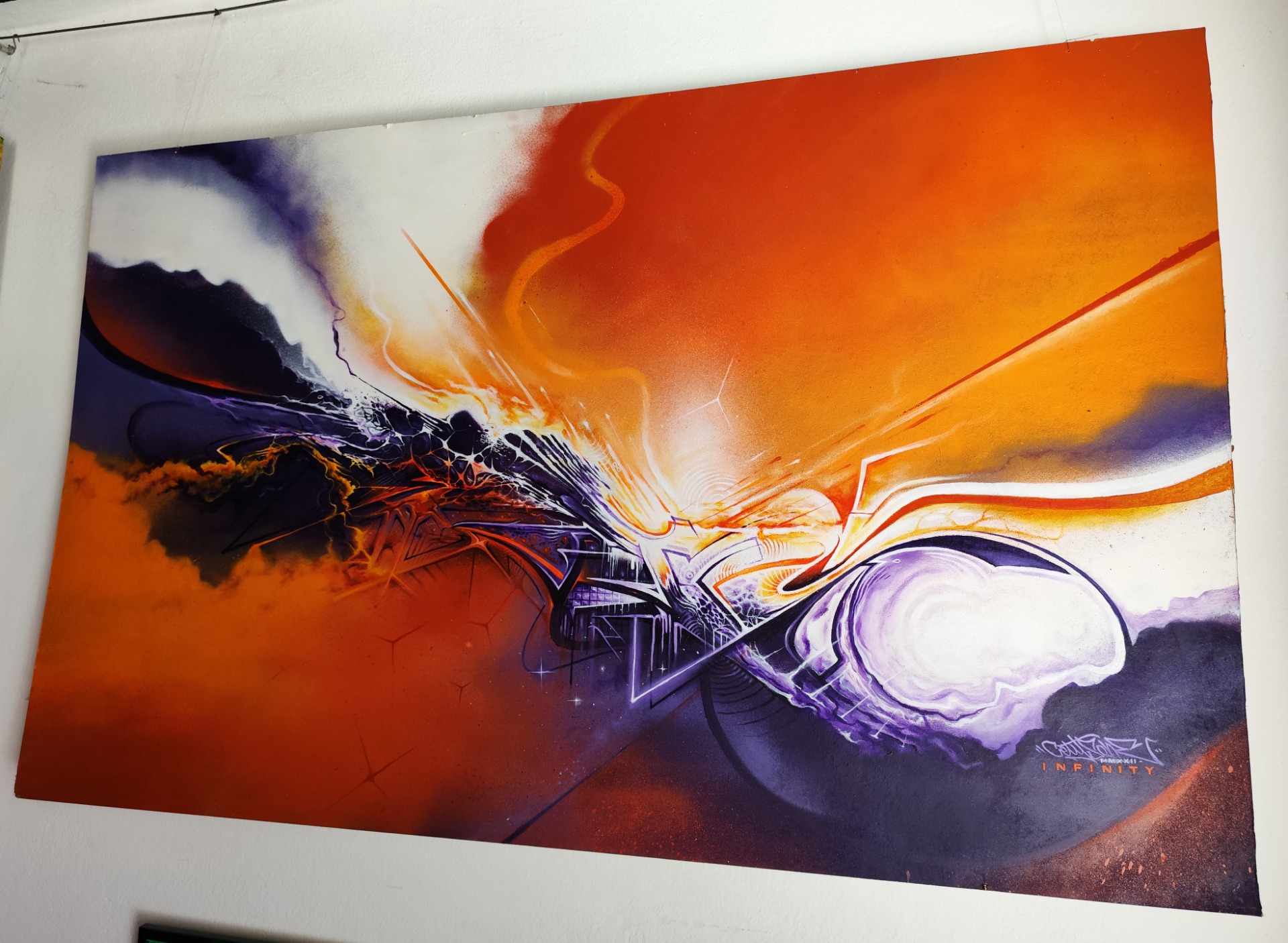 A painting referring to the infinity of color compositions and graffiti lettrism. The construction of the piece takes place in a horizontal figure eight as a reference to infinity and also the DNA formula where two lines constantly intersect and thus define genetic information. Something similar happens in the creation of these works of art. We are in a constant spiral of trial and error, courage and despair, company and solitude. However, from these falls and rises something is born that will materialize this painful journey into a time capsule that will forever bring this cycle to the next and next viewer. Because nothing is unambiguous and therein lies the beauty of being.