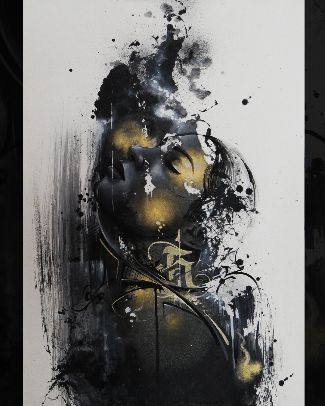 Piaty zo série obrazov LETTRES D´OR - S - Zlaté Písmená. vždy zobrazuje čiernobielu tvár ženy z rôznych uhlov, situovanú v čiernej škvrne ako symbol častého vrhania zlého svetla na človečenstvo ako také, sústavne sa snažiac pošpiniť alebo začierniť niekoho reputáciu alebo meno. Zlatá farba ako oslobodenie sa z tohto svetového trendu. Ako symbol grácie, a elegancie akou sa tento nekonečný problém dá prežiť s ľahkosťou a ukľudňujúcim nadhľadom. Je prekvapivé ako taký statický objekt ako je obraz, môže pôsobiť tak dynamicky a esteticky, že povýši priestor spokojného majiteľa, na pútavú zónu zdôrazňujúcu hodnoty a postavenie daného človeka. Ideálne do luxusných priestorov kde má možnosť vyniknúť každé jedno zlaté písmeno tejto série.