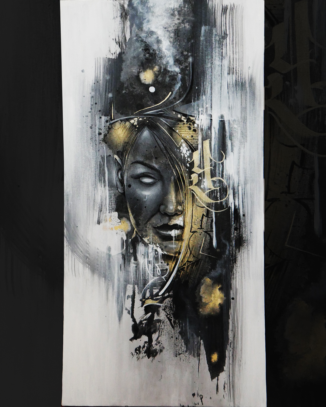 The fourth in the series of paintings LETTRES D´OR - Y - Golden Letters. always depicts a black and white face of a woman from different angles, situated in a black spot as a symbol of the frequent casting of bad light on humanity as such, constantly trying to tarnish or blacken someone's reputation or name. The golden color as a liberation from this world trend. As a symbol of grace and elegance with which this endless problem can be experienced with ease and a calming perspective. It is surprising how such a static object as a painting can act so dynamically and aesthetically that it elevates the space of a satisfied owner to an eye-catching zone emphasizing the values and status of the person. Ideal for luxurious spaces where every single golden letter of this series has the opportunity to stand out and shine.