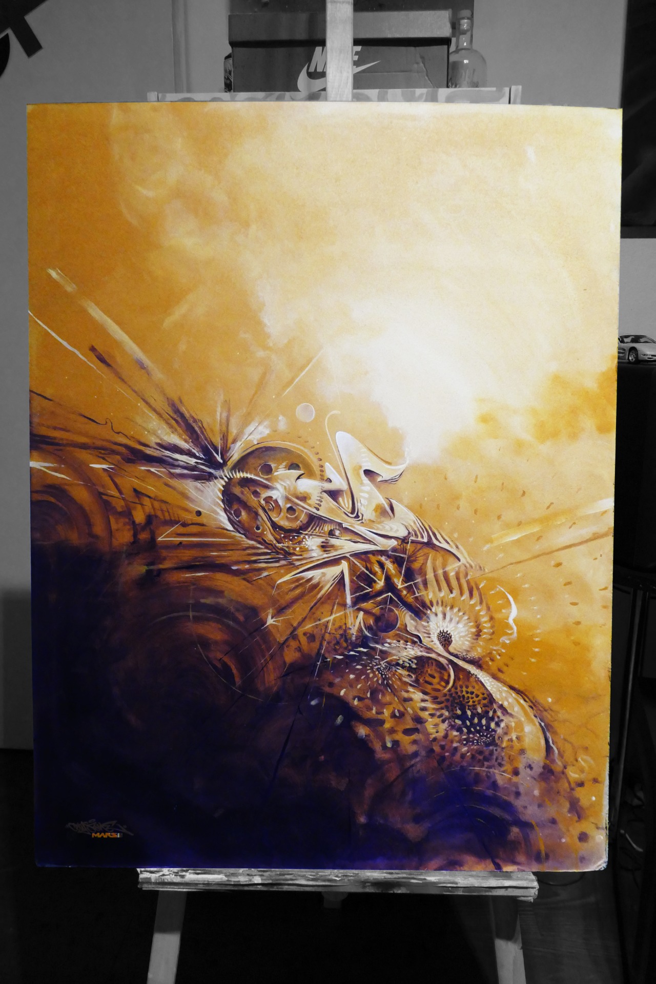 The painting titled Mars hides a lot of mysteries, despite the fact that it is one of the most explored planets. Well, we are still haunted by the curiosity to answer all the questions. The combination of dark purple with mustard yellow gives a touch of something otherworldly. Something that has its own atmosphere, rules and principles. The letters are decorated with indefinite organic and inorganic textures, among which individual phases of the planet occasionally occur. The grateful abstract basis of the letters CETYS provides a suitable platform for a rich representation of the so-called wildstyle graffiti style. The light from behind the clouds brings the omnipresent sun, which sheds light even into the darkest corners of this place. After all, admit it yourself.