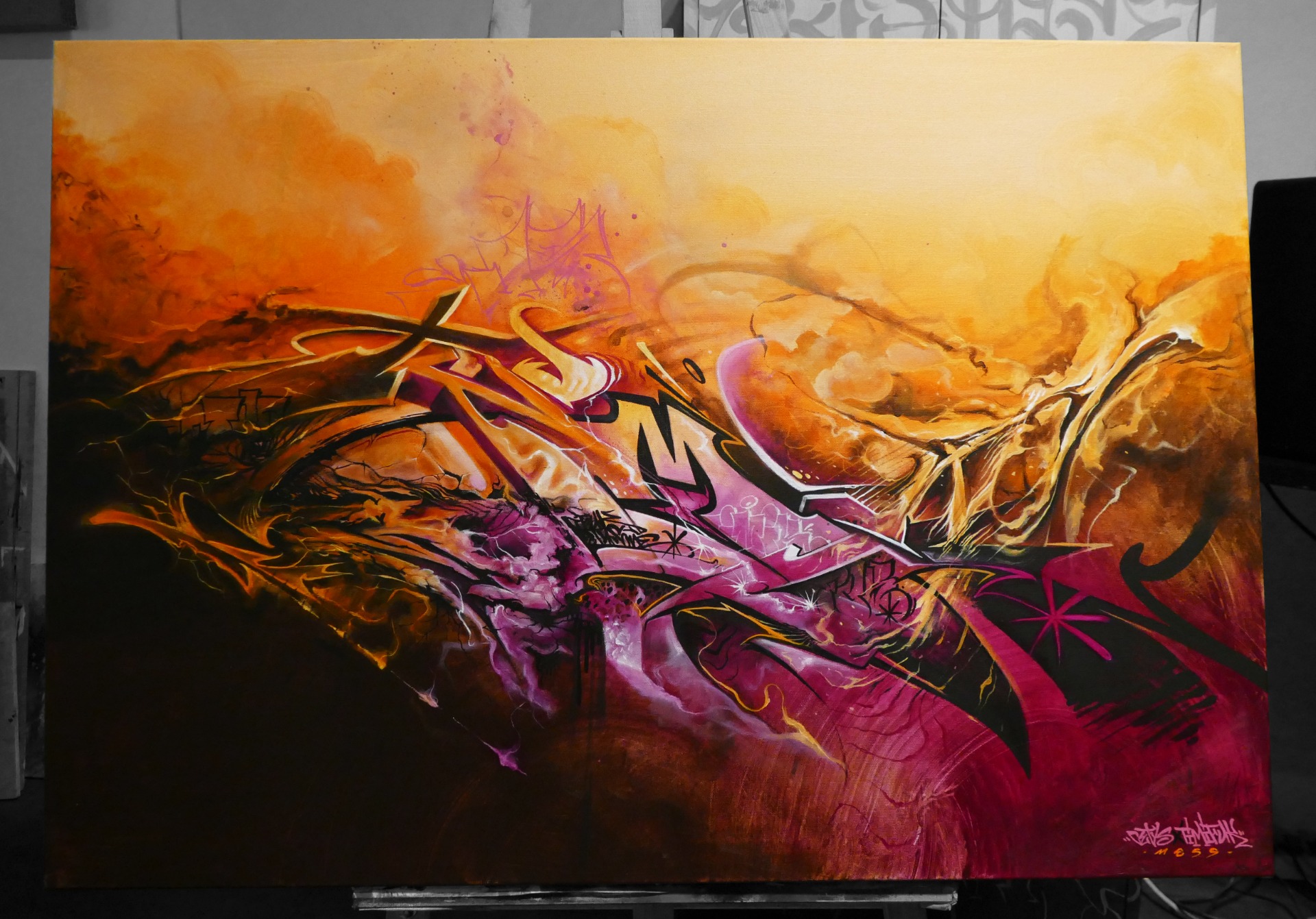 This thing is one big Mess. The second collaboration with Timifuk brings rather earthy and warmer colors. It leaves a full dose of stylistics incorporated in controlled chaos. The standing out letters express a certain dominance that likes to acknowledge its environment from which this entire graffiti movement originated. It looks imaginative in the room and attracts the attention of many eyes.