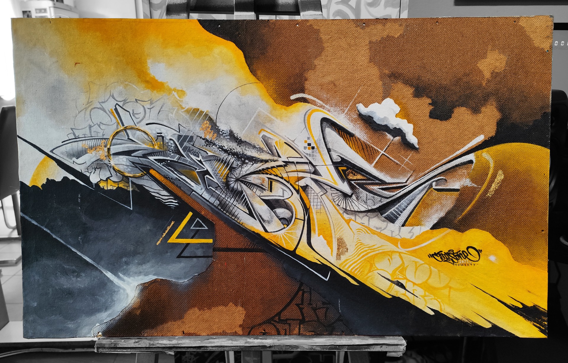 A person who overcomes poverty once and learns to extract a positive affirmation or lesson from even the most difficult moment in his life has much more power to overcome even the most critical moments of his future. We have all found ourselves there once. Because wealth is not only material. We all have true wealth in our souls. Even though I did not own another roll of canvas at that moment, I tried to get the most out of it, and from all the leftovers, whether paint or canvas, I found the inner strength and conviction to materialize this idea into this original piece of elegant processing of my unpredictable form of graffiti lettrism, leaving an important message - the power of will is sometimes much more resonant than the power of money. The name comes from the English word "poverty", but I replaced the letter "V" with "W" changing the meaning of the word poverty to strength - "POWERTY"
