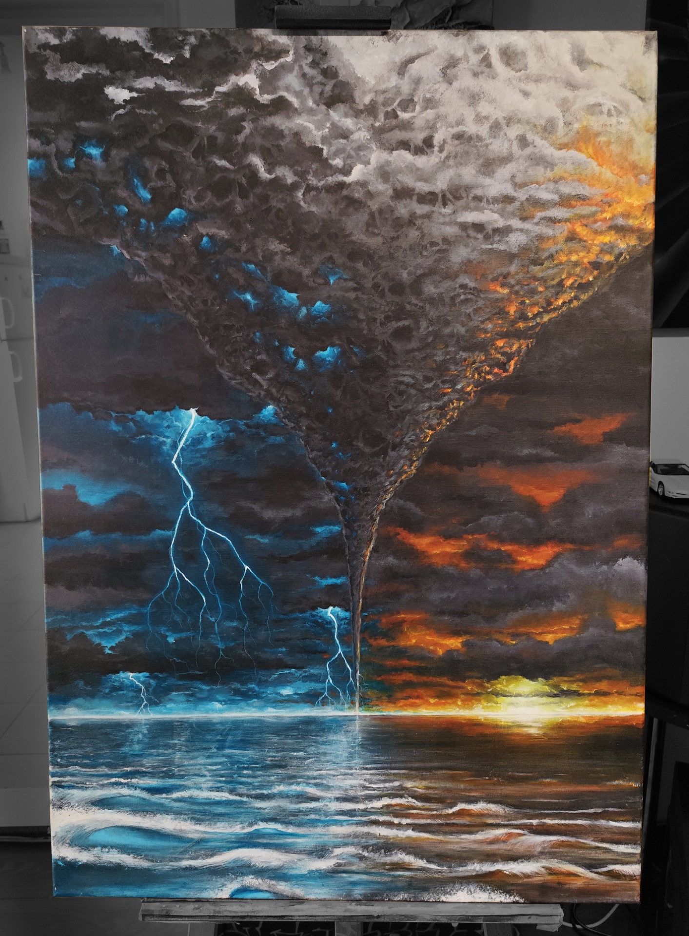 Typické zobrazenie dvoch svetov, búrky a pokojného západu slnka. Stredom týchto dvoch miest sa valí vysoký tvar lieviku typický pre tornádo plné momentov, kde oblaky pripomínajú ľudské lebky ako memento svojej dôležitosti a vynútenej pozornosti. Už len tá impozantná veľkosť tejto blížiacej sa katastrofy naháňa rešpekt a obavu o svoj holý život. Pri predstave že je niekto z nás svedkom takéhoto úkazu naživo, behá mráz po chrbte a vnútorne si prajeme všetkými 10 prstami na rukách prekríženými, aby nás tento úkaz iba obišiel, prípadne spôsobil čo najmenšie možné škody. Našťastie je to len obraz a my sa môžeme kochať jeho nádherou.