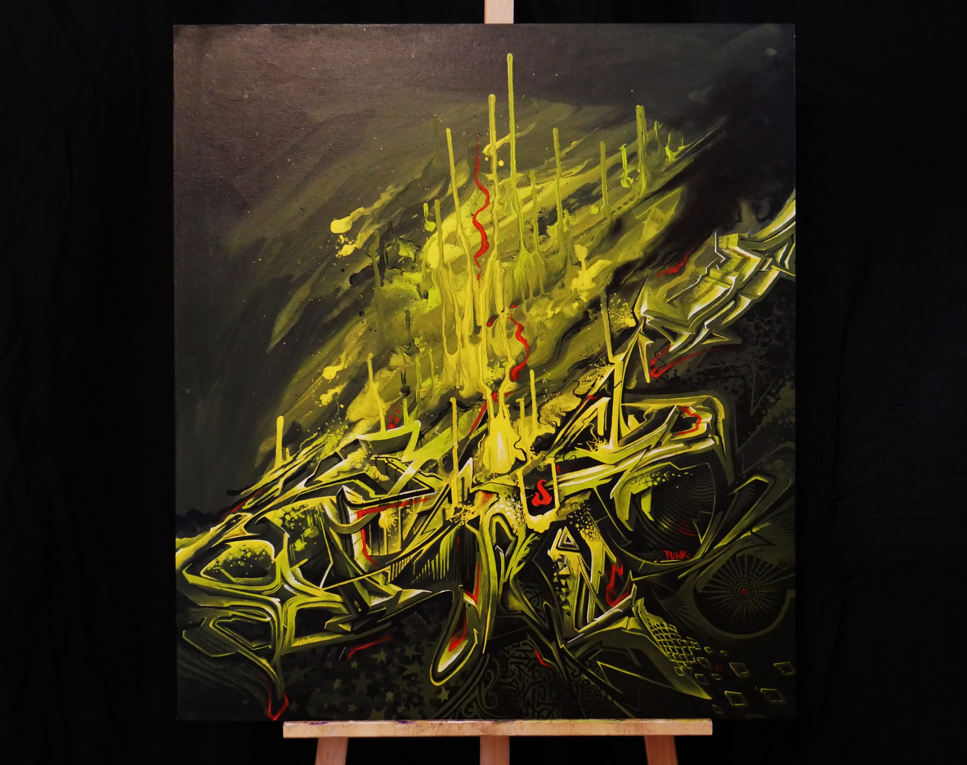 Tento unikátny kúsok je výsledkom spolupráce s mojím dlhoročným crewmanom Sainterom. Halucinogénne pozadie stekajúcej farby nahor len zvýrazňuje svoju slobodu a iba otvorená myseľ vie pochopiť absurdnosť tohoto javu. Dizajnové prvky písmen oboch našich pseudonymov len obohacuje tento zvláštny toxický jav, pri ktorom tie línie stekajúcej farby sa vlnia vo funkovom rytme, akoby tancovali na nejakú trippy psychadelickú hudbu. Sofistikované textúry a detaily nás vracajú späť do reality, avšak v tomto prípade je iba na okraji. Kombinácia toxickej žlto-zelenej s vojenskou khaki zelenou zanecháva vzácnu dualitu obrazu. K tomu asi 5 percentná červená vyvolávajúca hazard a opatrnosť pri nakladaní s takýmito materiálmi. Jeden z tých obrazov pri ktorých sa mi v hlave zapne zvláštna hudba a núti ma skúmať každý jej tón a každé jej zákutie.